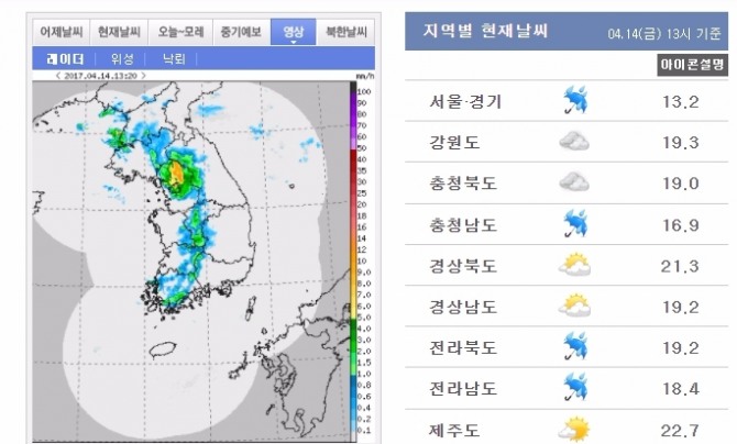 이미지 확대보기기온은 서울,경기가 13.2도, 충청남도 16.9도, 전라북도 19.2도, 전라남도 18.4도다. 강수량은 중부지방에 5-10mm, 남부지방 5mm 안팎으로 적겠지만, 비가 내리는 동안 벼락이 치고 돌풍이 불면서 요란하게 내리겠다.