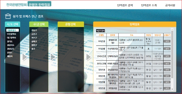 이미지 확대보기전국은행연합회는 은행의 정규 영업시간(평일 오전 9시에서 오후 4시)외 운영하는 탄력점포 정보를 홈페이지를 통해 공지하고 있다.