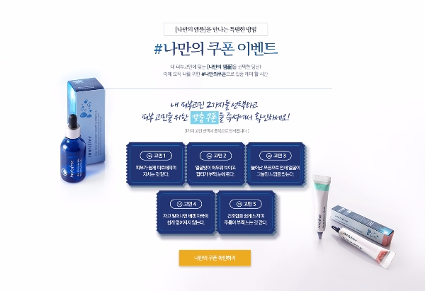 이니스프리가 자신의 피부 고민을 선택하면 100% 당첨 쿠폰을 증정하는 ‘나만의 쿠폰’ 이벤트를 진행한다. 쿠폰은 제주 용암해수 부스팅 앰플과 이펙터 2종 본품 증정부터 앰플 구매 시 이펙터 무료 증정, 1000원 이상 구매 시 잇츠 리얼 스퀴즈 마스크 팩 1매를 증정하는 쿠폰 등 다양하게 구성돼 있다.
