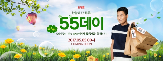 위메프는 5월 황금연휴를 더욱 특별하게 보낼 수 있도록 특가 기획전과 이벤트를 풍성하게 준비했다고 밝혔다. 위메프는 5월 5일에도 매월 개최하고 있는 파격특가 할인행사 ‘위메프 55데이’를 진행한다. 이번 ‘위메프 55데이’에는 해피머니상품권, 제주렌트카, 미코 탁상용 선풍기, 아임닭 닭가슴살, 땡큐 화장지, 푸마 트레이닝복, 뉴발란스 운동화, 전국 숙박권 그리고 뮤지컬 드립걸스를 55원에 제공한다. 또한, 아디다스, 리복 슬리퍼, 원마운트 워터파크 종일권 등은 555원, 거제씨월드, 아산스파비스, 뮤지컬 드림걸스는 5555원, 보루네오 4인소파와 거실 테이블은 55만5555원에 판매한다. 모두 한정수량 준비되어 있다.