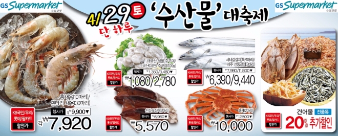 GS리테일이 운영하는 ‘신선하고 즐거운 생활’ GS수퍼마켓은 이달 29일 단 하루, 수산물 소비 촉진을 위한 대박 할인 이벤트, ‘산지 직송 수산물 대축제’를 진행한다. GS수퍼마켓은 지난 주 1만3000원~1만4000원에 판매됐던 제주선동갈치 3마리와 7000~8000원에 판매됐던 국내산 손질오징어(2마리)를 행사 카드(KB국민/우리/롯데/팝카드)로 결제 시 각 9440원, 5570원에 판매한다. 또 같은 카드로 결제 시 산소포장으로 신선도를 향상시킨 국산 활암꽃게를 100g당 3990원, 태국산 생물 쭈꾸미(100g)를 1080원에 제공해 고객들이 알뜰하게 제철 해산물을 즐길 수 있도록 할 예정이다.