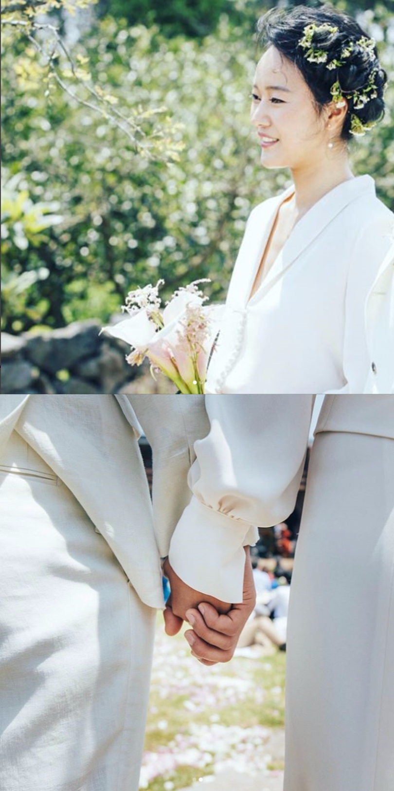 이미지 확대보기윤진서는 1일 오전 자신의 인스타그램을 통해 머리에 소박한 풀꽃 화환 장식을 하고 웨딩드레스 대신 흰색 정장 차림을 한 모습과 함께 신랑의 얼굴을 밝히지 않은 채 두 손을 꼭 잡고 있는 사진에 결혼 소감을 직접 게재했다.