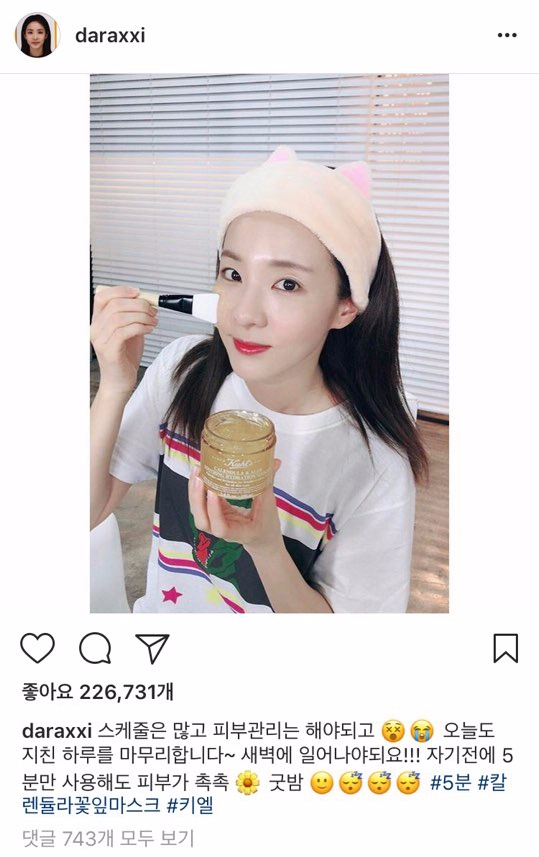 공개 된 사진 속에서 산다라박은 화장기 없는 편안한 모습으로 자체발광 동안 피부를 과시했다. 특히, 촉촉한 피부를 유지하는 아이템을 ‘#칼렌듈라꽃잎마스크’라는 해시태그로 소개해 ‘산다라박 마스크’에 대한 네티즌들의 관심이 이어지고 있다.