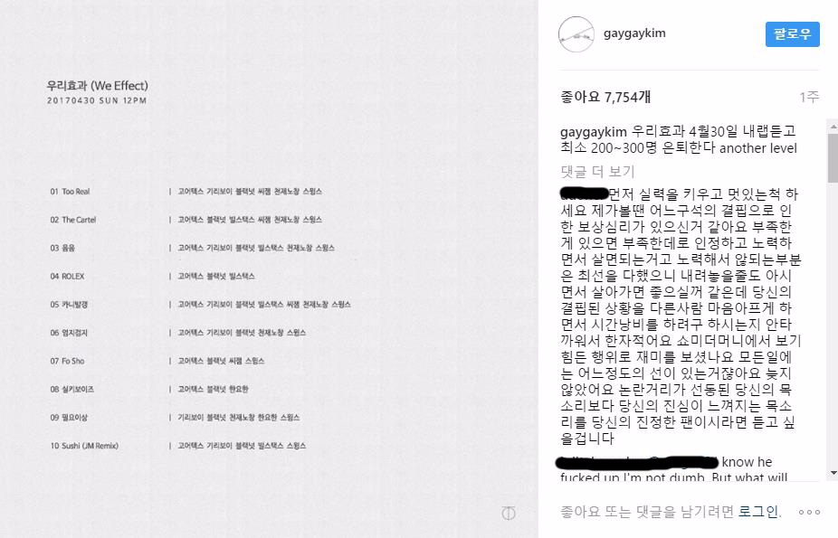 이미지 확대보기블랙넛은 지난 30일 저스트 뮤직의 컴필레이션 출시에 맞춰 본인의 SNS에 앨범 곡 리스트와 함께 ‘우리효과 4월 30일 내 랩 듣고 최소 200~300명 은퇴한다. another level’이라며 글을 올렸다.