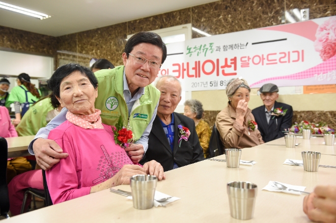 농식품전문매장 농협하나로마트를 운영하고 있는 농협유통은 8일 어버이날 임직원 30여명이 참여한 가운데 잠실사회종합복지관에서 지역 내 저소득 및 소외 계층 어르신 100여명을 모시고 카네이션을 달아 드리고 과일을 대접하는 행사를 가졌다. 이번 행사를 통해 농협유통은 지난 22년간 함께 성장을 도와준 지역사회에 대한 감사와 나눔의 마음을 전했다. 또 임직원 30여명이 어버이날을 맞아 지역 어르신께 정성껏 준비한 카네이션을 달아드리며 말벗이 되어주는 등 온정이 넘치는 자리를 마련했다.