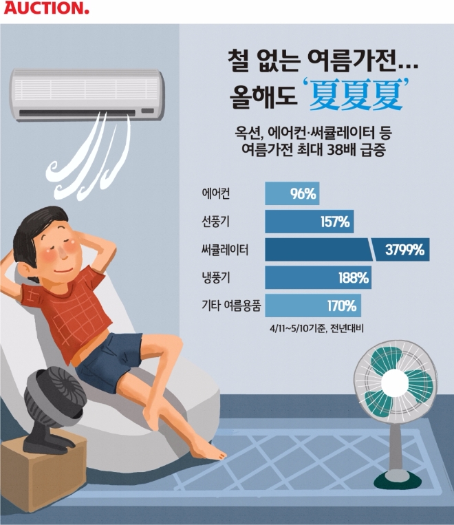 써큘레이터는 이달 들어 하루 평균 300개 이상 팔려나가면서, 옥션 계절가전 베스트셀러에 다수 이름을 올리고 있다. 이밖에 물만 넣어도 시원한 바람이 나오는 냉풍기도 3배(188%) 가까이 판매되며 찾는 이가 늘었다.