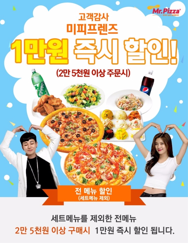 MP그룹의 미스터피자가 5월 고객 감사 행사로 ‘미피프렌즈 1만원 즉시할인 이벤트’를 진행한다. 미스터피자 홈페이지 VIP 이용고객, 카카오톡 플러스 친구에게 18일부터 문자로 발송되며 2만5000원 이상 주문 시 할인 혜택을 받을 수 있다. 할인쿠폰은 1인 1매 1회로 사용이 제한되며 미스터피자 전 매장에서 6월14일까지 사용할 수 있다.