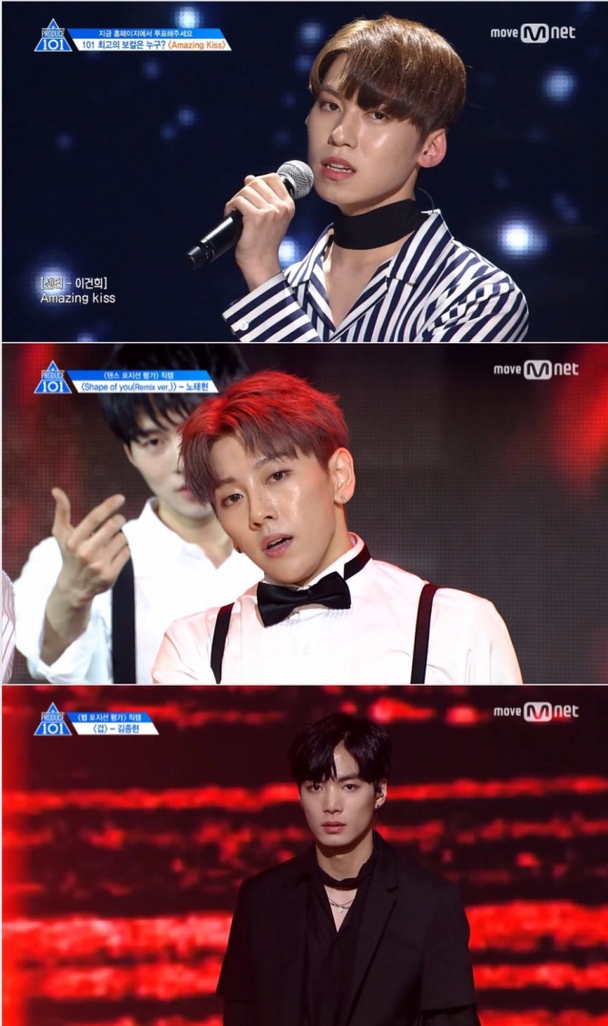 이미지 확대보기19일 밤 방송된 Mnet '프로듀스 101 시즌2'(이하 '프듀2') 7회에서는 지난주에 이어 랩, 보컬, 댄스 3개 부문 포지션 평가가 진행됐다. 현장투표 결과 댄스 포지션에 노태현, 보컬에 이건희, 랩 김종현이 각각 전체 1위로 선정돼 베네핏 11만표를 가져갔다.