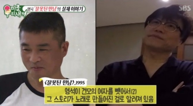 이후 김건모는 대박을 친 자신의 히트곡 '잘못된 만남' 탄생 비화를 밝혔다. 그는 "대학 시절 여자 친구가 1명 있었는데 유영석 형이 빼앗았다"고 폭로했다. 그는 "하루, 이틀 사귀었다"라고 덧붙였다.