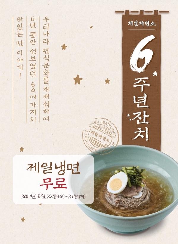 CJ푸드빌이 운영하는 한국식 면 전문점 제일제면소가 브랜드 6주년을 맞아 고객감사 이벤트를 진행한다. 오는 22일부터 27일까지 제일제면소 매장을 방문해 6주년 홍보물 사진을 보이면 테이블당 제일냉면 한 그릇을 무료로 제공한다. 제일제면소 19개 전 매장에서 진행되며, 자세한 내용은 제일제면소 홈페이지에서 확인 가능하다.