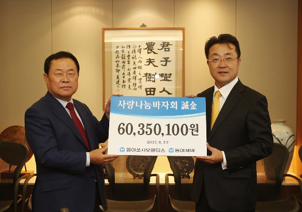 동아쏘시오그룹은 동아에스티 본사에서 ‘사랑나눔 바자회’ 수익금 전달식을 갖고 동대문구 사회복지협의회에 바자회 수익금 6035만원 전액을 기부했다. 건강기능식품, 구강청결용품, 생활용품, 동아오츠카 음료 등과 임직원들로부터 기증받은 물품을 판매해 얻은 수익금은 동대문구사회복지협의회에 전액 전달해 저소득층 및 소외계층 지원사업을 위해 사용하고 있다.