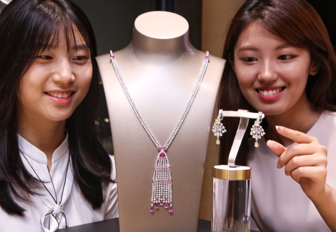 행사기간 동안 3.02캐럿의 옐로 다이아몬드와 1.21캐럿, 1.19캐럿 화이트 다이아몬드를 활용해 총 20.21캐럿의 다이아몬드를 세팅한 '익스트림리 피아제 이어링(6억6850만원)'과 다이아몬드 474개와 핑크빛 사파이어 29개로 이뤄진 '라임라이트 파리 뉴욕 네크리스(5억6150만원)'를 현대백화점에서 단독으로 선보인다.