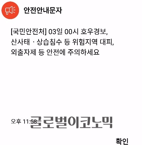 이미지 확대보기이에 국민안전처는 3일 00시를 기준으로 '호우경보, 산사태, 상습침수 등 위험지역 대피, 외출자제등 안전에 주의해주세요'라는 문자를 발송해 시민들의 안전을 당부했다.
