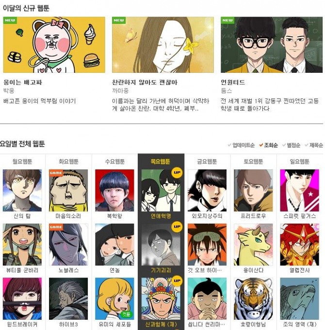 이미지 확대보기그 중 요일 별 조회수 1위를 기록하고 있는 웹툰은 무엇일까? 그리고 6월~7월 연재를 시작한 신규 웹툰과 재연재되는 작품은 어떤 것이 있는지 알아본다.