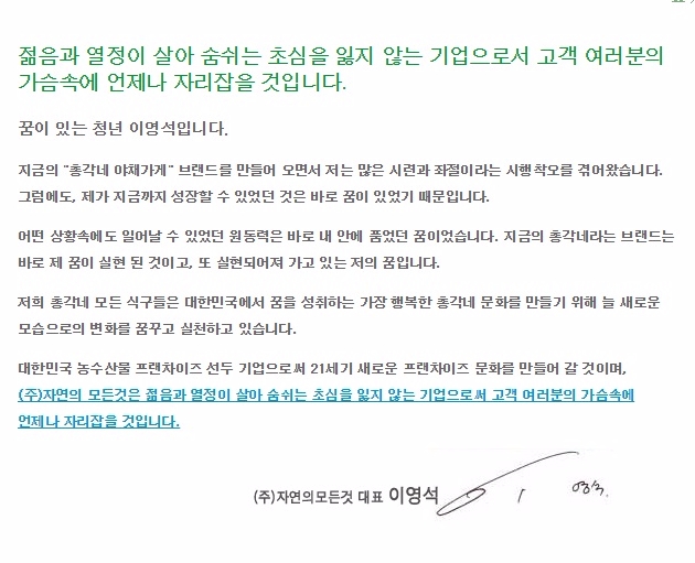 이영석 대표는 논란이 불거지자 총각네 야채가게 홈페이지를 통해 장문의 사과문을 게시, “고등학생 시절부터 생존을 위해 밑바닥부터 치열하게 장사를 하다보니 부족한 점이 많았다”며 “욕부터 사람을 대하는 태도까지 무지했고 무식했다”고 말했다.