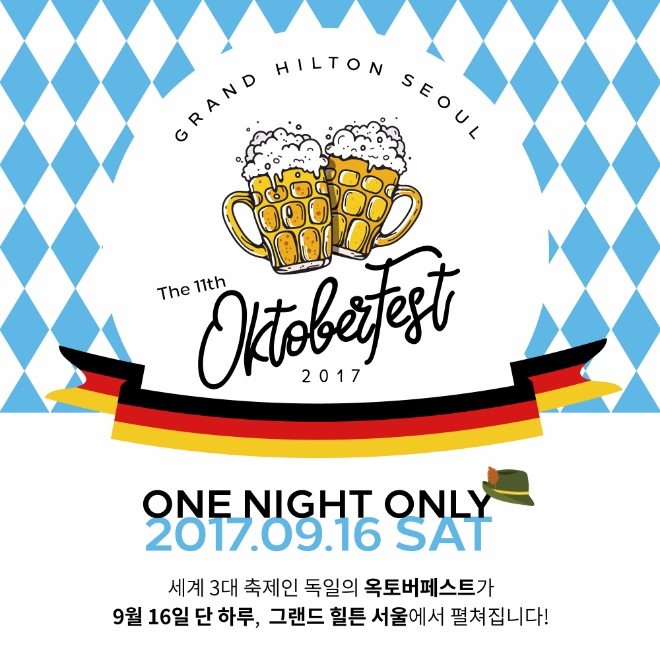 그랜드 힐튼 서울은 9월 16일 제 11회 옥토버페스트 개최를 맞이하여 옥토버페스트 전용 패키지를 런칭한다. 한국에서 쉽게 찾을 수 없어 희소성 높은 독일 최고 브루어리 아잉거 맥주를 무제한으로 만날 수 있는 옥토버페스트는 9월 16일 오후 6시부터 단 하루 동안 펼쳐진다. 본 패키지는 15만원 상당의 옥토버페스트 티켓 2장과 객실 1박, 옥토버페스트 축제 이후 늦은 시간까지 편안하게 쉴 수 있도록 오후 2시 레이트 체크아웃 서비스를 제공하며, 체크인 후에는 채광이 가득한 수영장과 체련장, 사우나 등을 모두 무료로 이용할 수 있어 축제를 더욱 풍성하게 즐길 수 있다. 9월 15일~17일 기간 동안 숙박이 가능하며, 패키지 가격은 30만원 상당의 옥토버페스트 티켓 2장을 포함한 특별가로 29만원부터 시작한다.