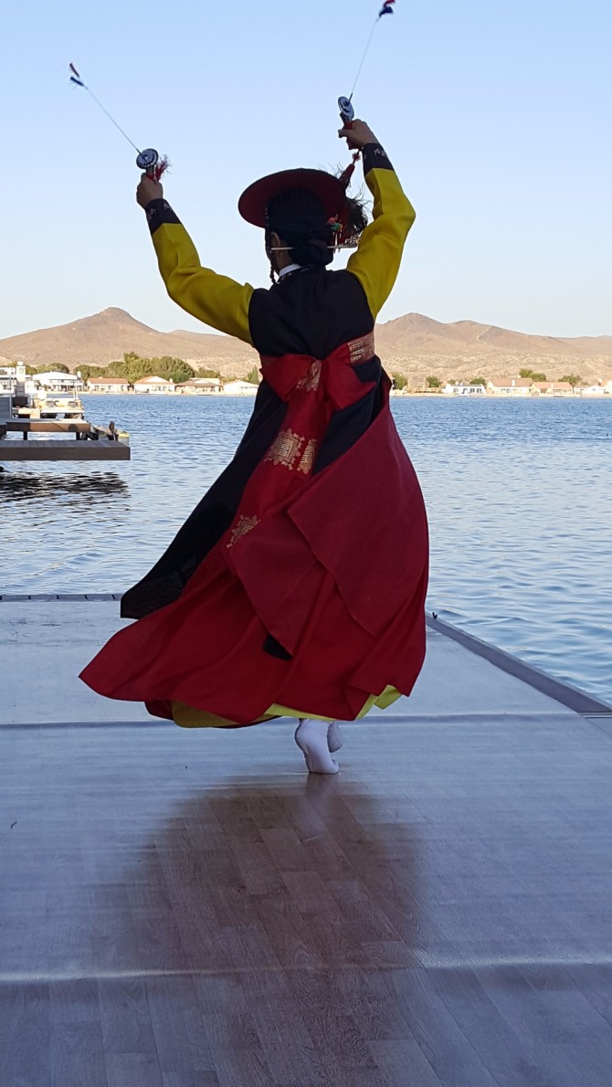 사막에 뜨는 달 벗 삼아/ 별이 뿌린 불사조 구역의 서쪽/ 인공호수에 전통 선율 띄우고/ 태고에 길 떠난 조상들과 이 땅에 살다 간 쪽빛 영혼들의 만남을 위해/ 칼춤을 춘다// 가라앉힌 열기가 진푸름으로 우지진 달빛 머금은 호수위로 피어오를 때마다/ 모하비 사막을 낀 계곡마다 거친 함성이 인다// 무리를 이룬 짠 모래알들이 조응하며 춤추는 날마다/ 이글대는 햇살에 온전히 자신을 맡겨/ 붉은 모래 위 소금으로 영글어가던 때/ 디딤과 사위를 사막묵상의 도구로 삼았던 여인/ 자신을 비운 백장미, 그 향 뿌리며 오늘도 살가운 춤춘다.늦게 시작했지만 춤 연마에 매진