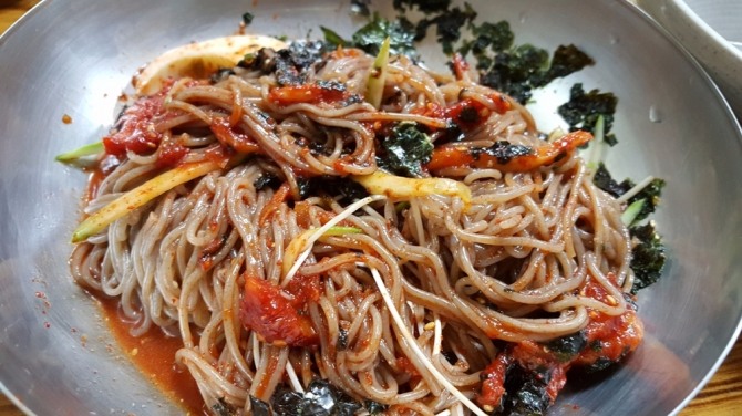 이미지 확대보기적당히 잘 절여진 황태채에 알맞게 양념에 버무려져 그 맛이 부드러우면서 입에 착 감겼다. 메밀면 또한 특유의 특징을 잘 살린 것 같다. 부드러운 식감에 구수한 향을 머금은 듯하다.