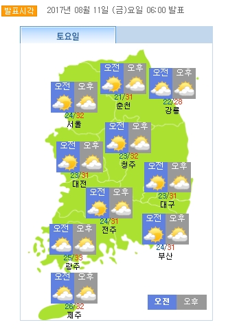 이미지 확대보기기상청은 토요일인 12일은 동해 북부 해상에 있는 고기압의 영향으로 흐린 가운데 서울 낮 최고기온이 32도를 기록하는등 막마지 무더위가 기승을 부릴 것으로 예보했다./사진=기상청 기상청은 토요일인 12일은 동해 북부 해상에 있는 고기압의 영향으로 흐린 가운데 서울 낮 최고기온이 32도를 기록하는등 막마지 무더위가 기승을 부릴 것으로 예보했다.