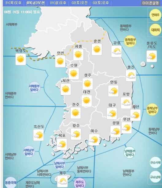 한낮 최고기온은 ▲서울 28도 ▲강릉 23도 ▲대전 28도 ▲대구 28도 ▲부산 27도 ▲광주 29도 ▲전주 28도 ▲울산 27도 ▲포항 24도 ▲제주 27도 ▲울릉·독도 21도 등이다.