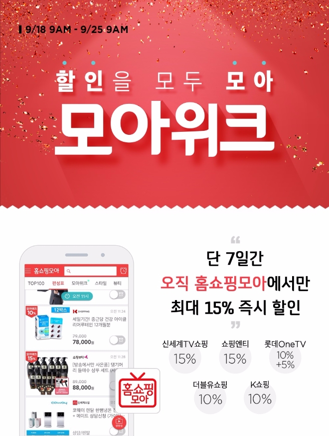 참여 방법도 간단하다. 오는 25일까지 홈쇼핑모아 앱으로 신세계TV쇼핑 등 5개 해당 T커머스 채널의 방송 상품을 구매하면 최대 15% 할인 혜택을 받을 수 있다. 각 T커머스사 별 자세한 할인 혜택은 홈쇼핑모아 앱에서 확인할 수 있다.