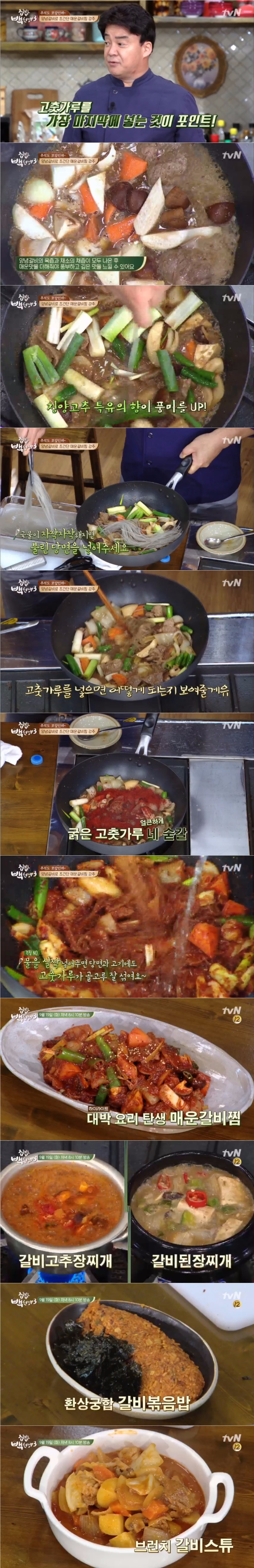 이미지 확대보기19일 밤 방송된 tvN '집밥 백선생3' 32회에서는 '양념갈비 활용 백서' 편으로 백종원이 마트에서 손쉽게 살 수 있는 냉동 양념돼지갈비를 활용한 매운갈비찜, 갈비스튜, 된장찌개, 갈비볶음밥 등의 요리를 선보였다.