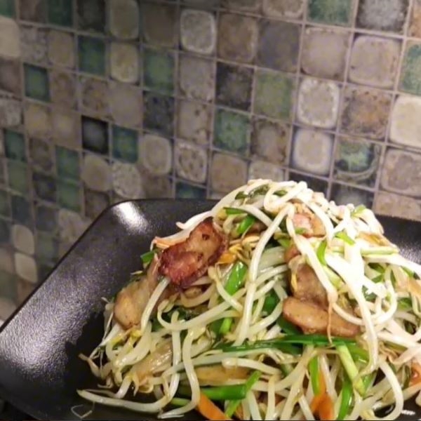 #베이컨 볶다가 양파, 당근--#쯔유 3큰술 #숙주 #부추 볶으면 완성 ♡ (쯔유대신 :간장2큰술 굴소스 반큰술)”이다.