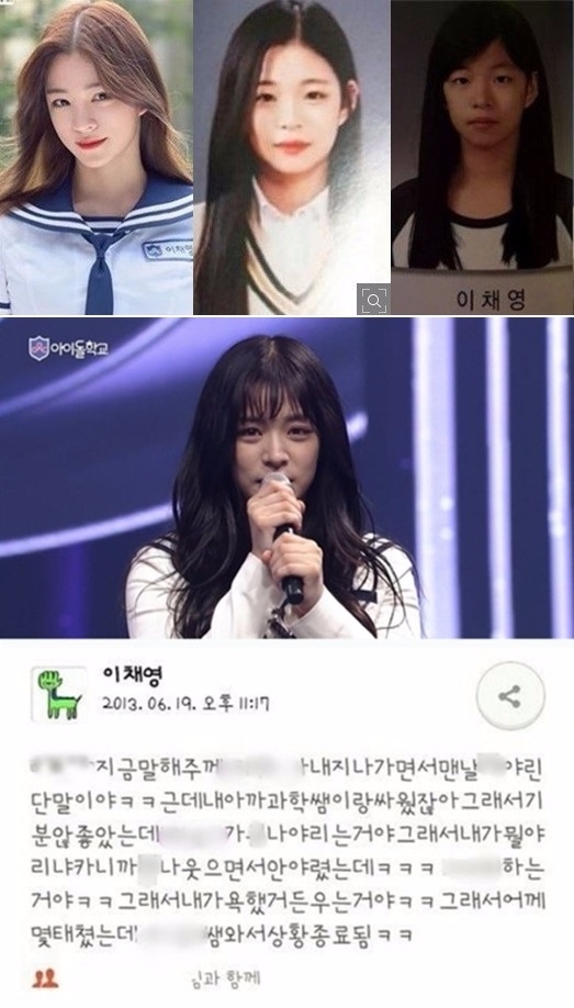 4년 전인 2013년에 작성된 이채영 SNS에는 “살짝 친거 같고 웃기는 XX네” 등의 욕설이 섞인 문장부터 장애인 비하 문장까지 다양했다. 이와 함께 “이채영이 초등학교 6학년 때 같은 반 학생을 왕따시켜 다른 초등학교로 강제 전학 조치됐고, 중학교 1학년 때는 한 학생을 폭행해 정학 징계를 받았다”는 폭로도 이어졌다.