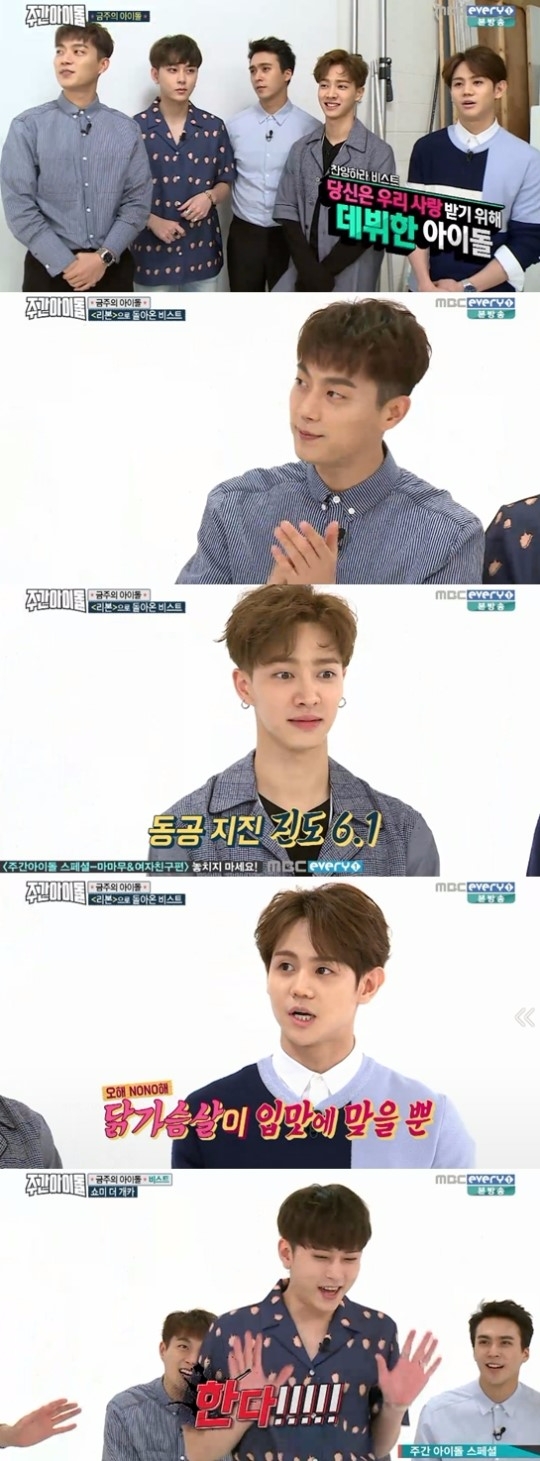 이미지 확대보기과거 방송된 MBC에브리원 '주간아이돌'에서는 그룹 비스트가 게스트로 출연했다. 이날 비스트는 컴백에 앞서 '주간아이돌' 출연을 했다. 애드리브로 공격하는 MC들에 대해 비스트는 "'주간아이돌' 개국 공신이다"며 자부심을 드러냈다.