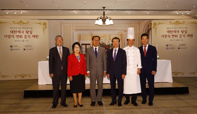 신세계조선호텔은 대한제국 120주년과 조선호텔 개관 103주년을 기념해 10월 11일(수) ‘대한제국 황실 서양식 연회음식 재현행사’를 진행한다. 신세계조선호텔은 대한제국 황실 연회음식 학술연구를 위한 연구비 지원과 더불어 고증된 자료를 바탕으로 메뉴를 재현해 냈다. 오는 10월11일(수) 서울 웨스틴조선호텔 연회장에서 그 동안 연구•개발을 통해 재현한 메뉴를 처음 선보인다. 황실 정식 만찬 메뉴는 정통 프랑스식 12 코스로 크넬 콩소메(고기 단자를 넣은 맑은 수프), 구운 생선과 버섯요리, 꿩 가슴살 포도 요리, 푸아그라 파테(페이스트리 반죽으로 만든 파이 크러스트에 고기, 생선, 채소 등을 갈아 만든 소를 채운 후 오븐에 구운 프랑스 요리), 안심 송로버섯 구이, 아스파라거스와 홀란데이즈 소스, 양고기 스테이크, 스트링 빈스 볶음, 샐러드, 파인애플 아이스크림과 치즈, 디저트와 커피 및 식후주로 구성됐다.