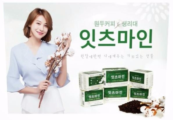 냄새걱정 없는 생리대, 안전한 생리대로 불리는 이 제품은 '잇츠마인' 제품이다. 천연식물인 원두커피 생두를 로스팅해하고 50마이크로미터 이하로 분말화, 이를 위해 위생용 패드에 도포해 내장했다.