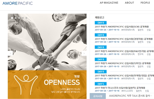 모집분야는 △SCM(물류, 생산관리) △경영지원(정보기술) △R&D(제품개발, 소재연구) △디자인(브랜드, 웹, VMD) △영업마케팅(마케팅전략·지원, 영업관리·지원) 등 5개 분야 10개 직무다. 아모레퍼시픽의 계열사 이니스프리도 디자인(VMD비주얼) SCM(글로벌물류, 포장재개발) 영업(영업관리, 유통영업관리, 점포육성, 글로벌) 분야에서 신입사원을 함께 뽑는다.