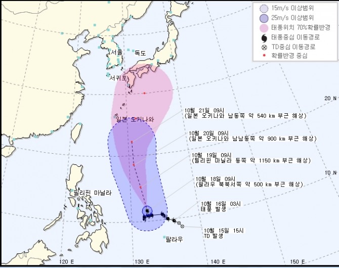 21일 오전 9시께는 일본 오키나와 남동쪽 약 540㎞ 부근 해상으로 이동할 전망이다.