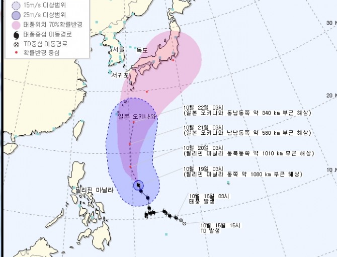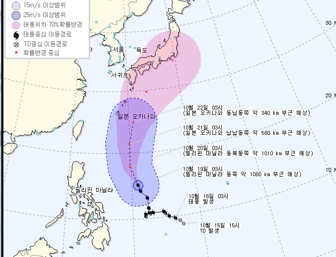 예상경로를 보면 20일 오전 3시 필리핀 마닐라 동북동쪽 약 1010 km 부근 해상을 거쳐 21일 오전 3시 일본 오키나와 남남동쪽 약 580 km 부근 해상에 접근할 것으로 예상됐다.