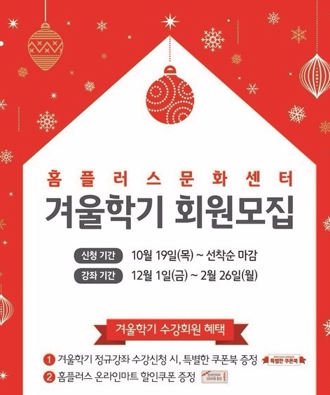 홈플러스는이날부터 29일까지 홈플러스 KB국민 제휴 신용카드로 겨울학기 수강료 7만원 이상 결제 시에는 5000원 즉시 할인 혜택이 있고, 정규강좌 수강시에는 수강생 전원에게 쿠폰북 증정한다.