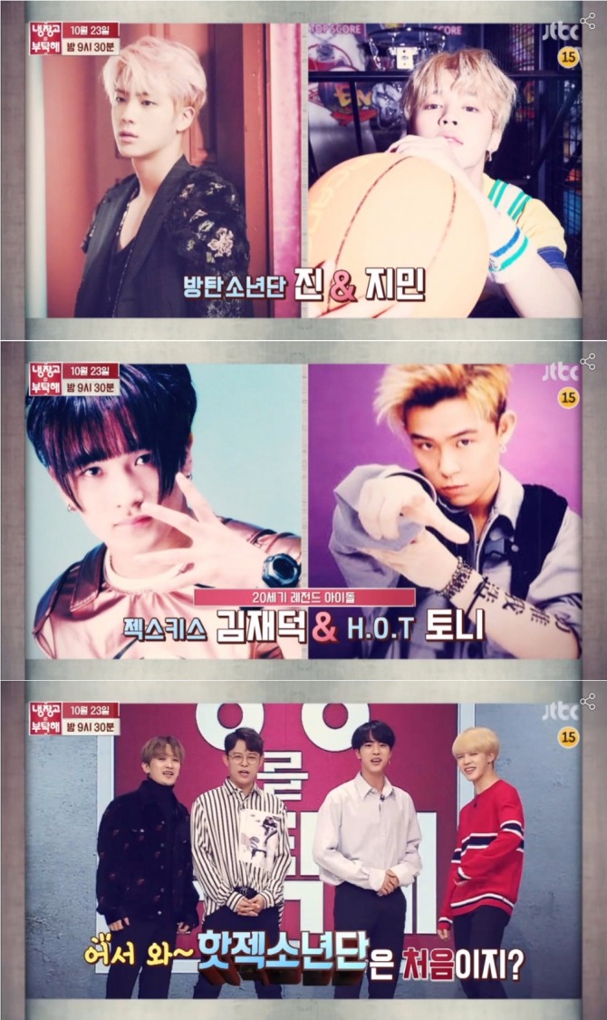이미지 확대보기23일 밤 방송되는 JTBC '냉장고를 부탁해'에서는 아이돌계 조상으로 불리는 김재덕과 토니안, 미국 빌보드 뮤직어워드에서 톱소셜 아티스트 상을 수상한 방탄소년단의 진과 지민이 냉장고를 공개해 화제를 모으고 있다.