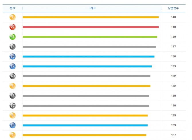 43번은 139회로 아깝게 2위를 차지했다. 이어 34번(137회 당첨), 20번(136회), 17번(133회) 순으로 나타났다.