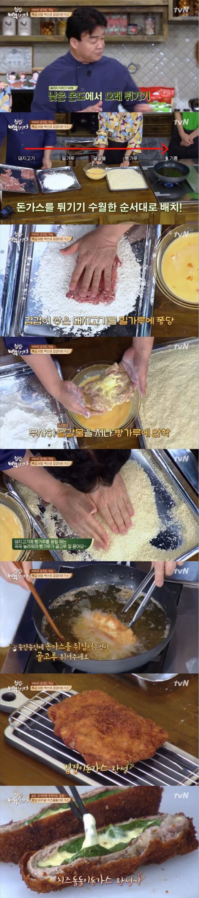 이미지 확대보기24일 밤 방송된 tvN '집밥 백선생 시즌3'(이하 '집밥 백선생3') 37회에서는 백종원이 남상미, 이규한, 양세형, 윤두준 네 제자들에게 돼지고기 불고기용으로 나오는 자투리 돼지고기와 대패삼겹살을 이용, 일본식 돈가스요리를 선보였다.