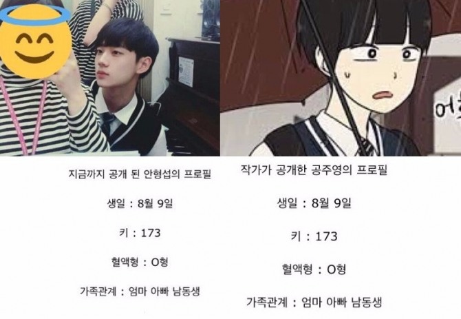 공주영과 안형섭의 프로필이 절묘하게 일치한다는 것도 눈여겨볼만하다. 생일, 키, 혈액형, 가족관계 등이 서로 동일하다. 연애혁명 작가인 ‘232’는 앞서 웹툰 캐릭터 중 공주영을 실제 인물을 모티브로 한 캐릭터라고 밝힌 바 있다.