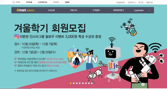 이마트 문화센터 겨울학기는 현장 접수, 온라인·모바일 홈페이지에서 모두 접수 가능하다.