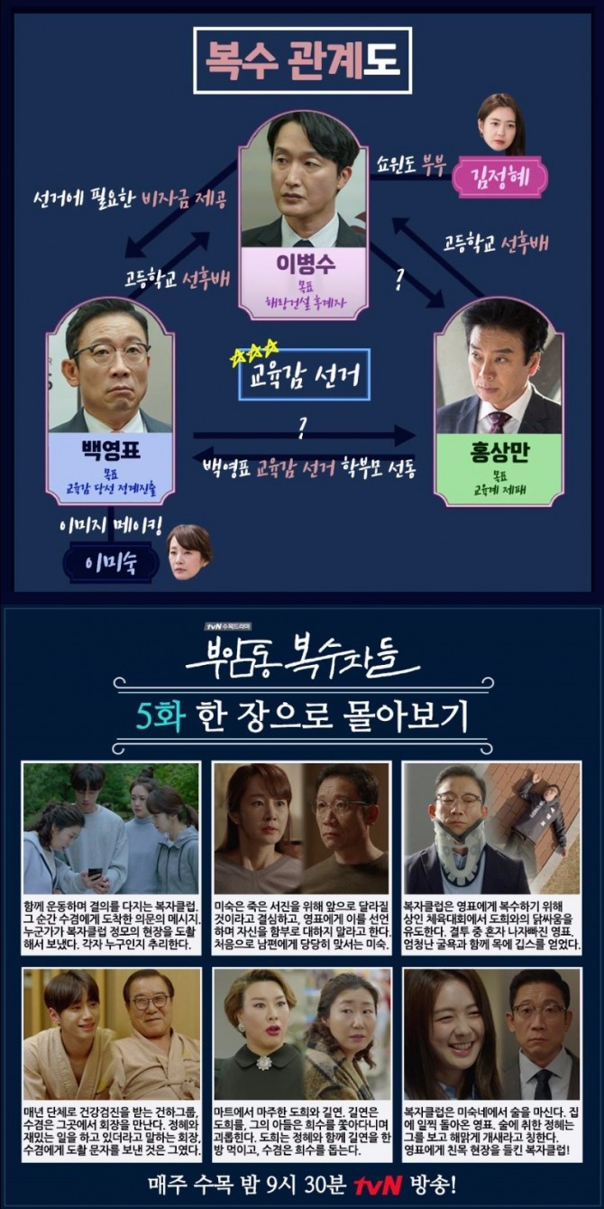 이미지 확대보기tvN 수목드라마 '부암동 복수자들'(연출 권석장, 극본 황다은·김이지) 제작진은 26일 공식 페이스북을 통해 지난 25일 밤 방송된 '5화 한 장으로 몰아보기'와 '복수관계도' 화보를 공개했다.