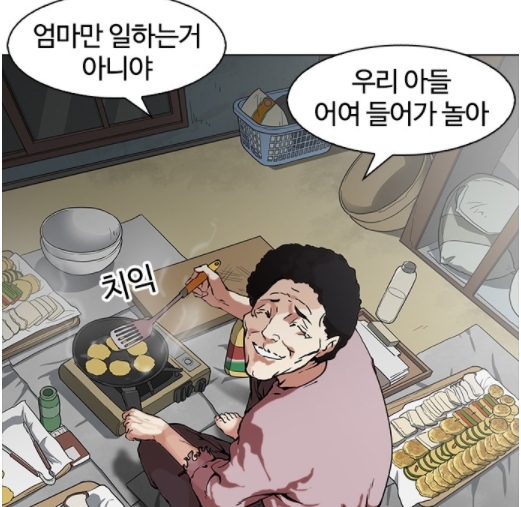27일 업데이트된 네이버 웹툰 ‘외모지상주의’ 명절 두 번째 편에서는 지난화에 이어 혼자 주방에서 음식을 장만하는 박형석의 어머니 모습이 그려졌다.