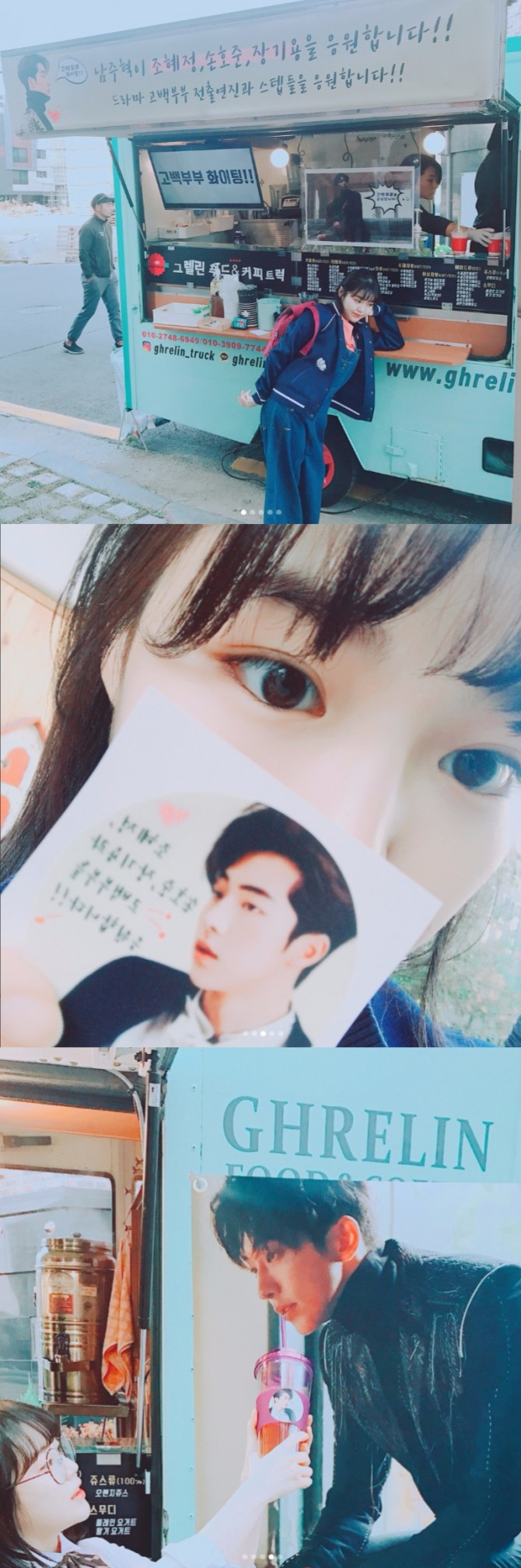 공개된 사진 속에는 '남주혁이 조혜정, 손호준, 장기용을 응원합니다! 드라마 고백부부 전출연진과 스테프들을 응원합니다!!'라는 문구가 적힌 플랜카드와 남주혁의 사진이 박힌 대형 배너가 걸려 있다. 조혜정은 푸드트럭에 몸을 기대고 있는 가 하면 남주혁의 사진에 음료수를 건네는 포즈를 취해 웃음을 선사했다.