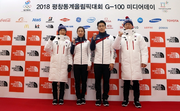 [글로벌이코노믹 임소현 기자] 2018 평창조직위 및 대한체육회의 공식파트너인 노스페이스는 31일 태릉선수촌에서 열린 ‘2018 평창동계올림픽대회 G-100 미디어데이’에서 대한민국 국가대표 선수단인 ‘팀코리아’가 착용할 공식 단복(시상복, 개‧폐회식복 등)을 공개했다. 모델로 참여한 팀코리아 선수들(최민정, 서정화, 최재우, 이상호-좌측부터)이 포즈를 취하고 있다.
