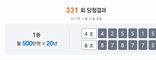 이미지 확대보기1등 연금복권 당첨번호는 ‘4조 425515번’과 ‘6조 878775번’으로, 당첨금은 매달 500만원씩 연금 형식으로 지급되며 세금을 뗀 실수령액은 390만원 정도의 액수다.