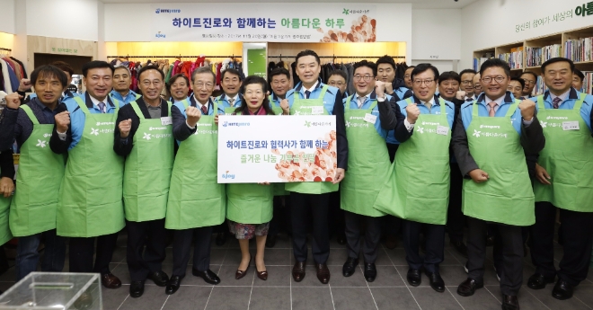 이미지 확대보기하이트진로는 20일 아름다운가게 광주첨단점에서 ‘나눔바자회’를 개최했다. 이번 바자회에는 하이트진로 김인규 대표를 비롯해 협력사 임직원 25여명도 자원봉사자로 참여해 기증물품 판매 등 봉사활동을 펼쳤다. 판매된 물품은 지난 9월 11일부터 10월 26일까지 약 7주간 하이트진로와 협력사 임직원이 기증한 물건으로, 3500여 점에 달한다. 이어 바자회 판매 수익금 전액과 함께 협력회사들과 하이트진로가 1대 1 매칭그랜트 방식으로 모금한 총 2000여만원을 아름다운가게 측에 전달했다