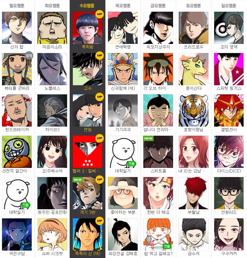 월요웹툰 ‘신의 탑’(SIU), 화요웹툰 ‘마음의 소리’(조석), 수요웹툰 ‘복학왕’(기안84), 목요웹툰 ‘연애혁명’(232), 금요웹툰 ‘외모지상주의’(박태준), 토요웹툰 ‘프리드로우’(전선욱), 일요웹툰 ‘조의 영역’(조석)으로 전 주와 순위 변동은 없다.