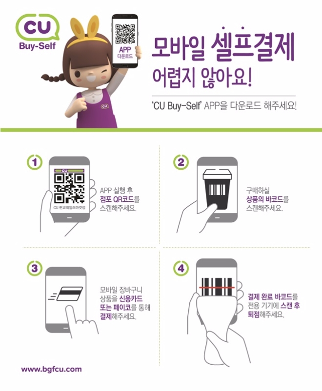 사용 방법은 ‘CU 바이셀프’ 앱을 실행하여 점포 곳곳에 비치된 고유 QR코드를 스캔한 후, 구매하고자 하는 상품(주류, 담배 제외)의 바코드를 고객이 직접 스캔하고 구매 수량을 결정하는 방식이다. 상품을 고른 후에는 앱에서 결제까지 가능하다.