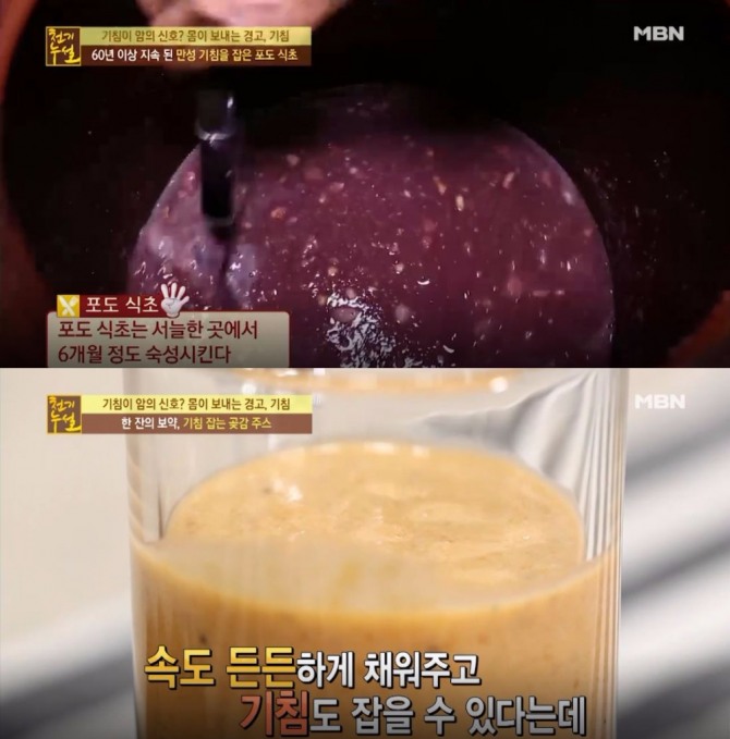 이미지 확대보기[천기누설 황금 레시피] 기침이 오래갈 때? 멈추는 법! 기침에 좋은 음식 '포도식초' '곶감주스' 만드는 법...MBN 시사/교양 프로그램 ‘천기누설’ 286회 <기침이 암의 신호? 몸이 보내는 경고, 기침>편에서는 기침이 잦아지는 시기 겨울을 앞두고 기침과 관련된 각종 건강정보를 전했다. 특히 이날 ‘천기누설’에서는 기침에 좋은 ‘포도식초’ ‘곶감주스’ 황금레시피를 소개해 눈길을 모았다. /사진=MBN 일요일 시사/교양 프로그램 '천기누설' 286회 '기침' 편, 2017년 11월 26일(일요일) 방송 영상 캡처