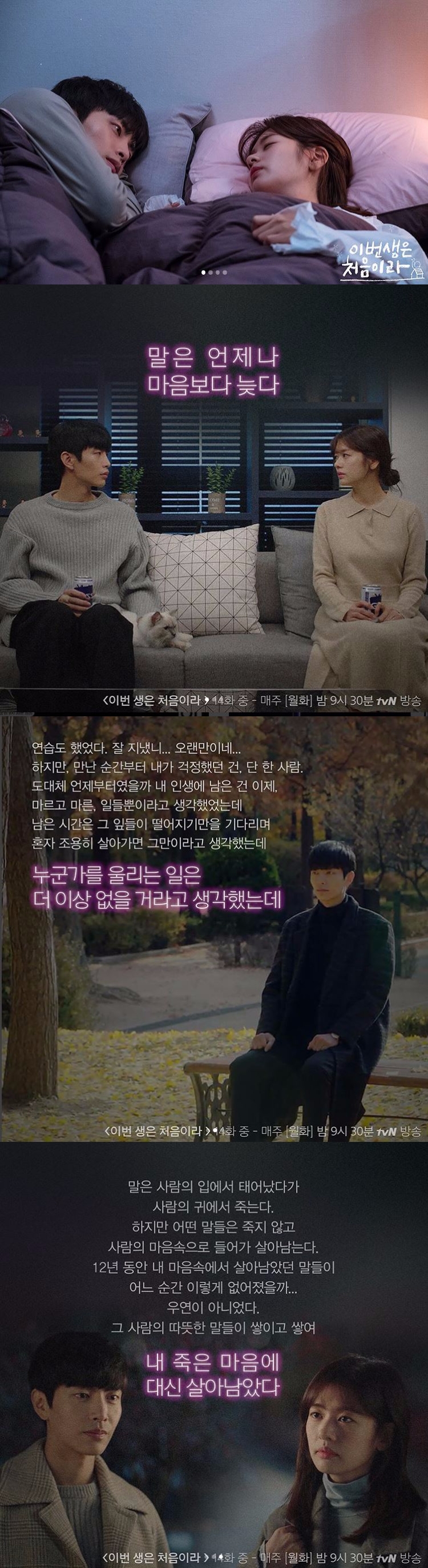 #tvN #월화드라마 #이번생은처음이라 #수지타산로맨스 #이민기 #정소민 #박병은 #이솜 #김민석 #김가은 #김민규 #이청아 #leeminki #jeongsomin #tvnfirstlife”라는 글과 함께 지난 11월 21일 방송된 ‘이번 생은 처음이라’ 14회 명대사가 담긴 사진 3장을 공개해 눈길을 끈다.
